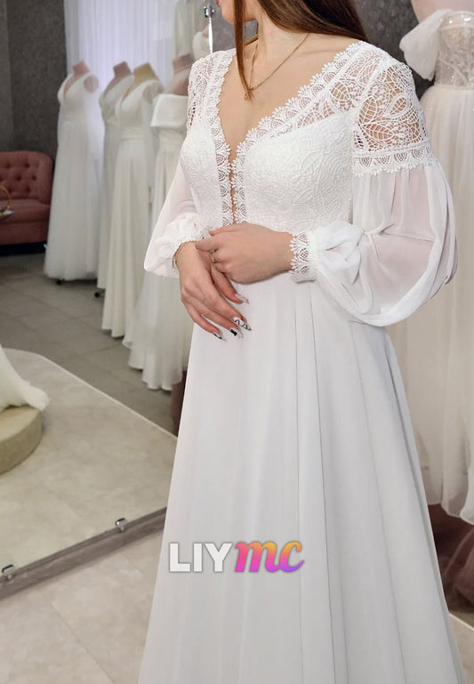V-Neck Long Sleeves Lace Appliques Chiffon A-Line Wedding Dress