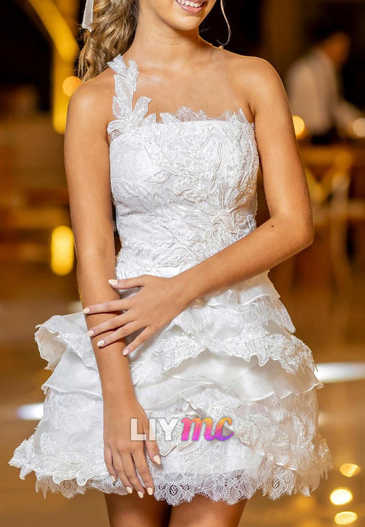 Asymmetrical Sleeveless Tiered Appliques Short Wedding Dress