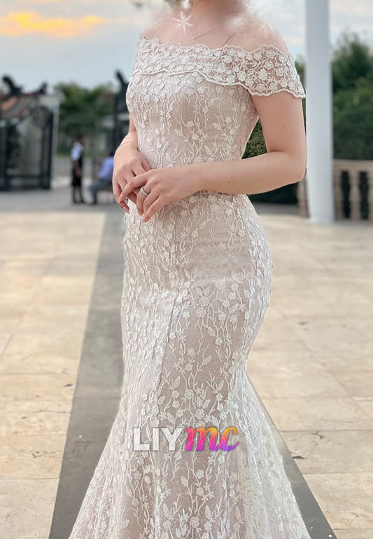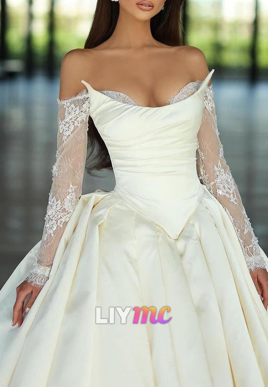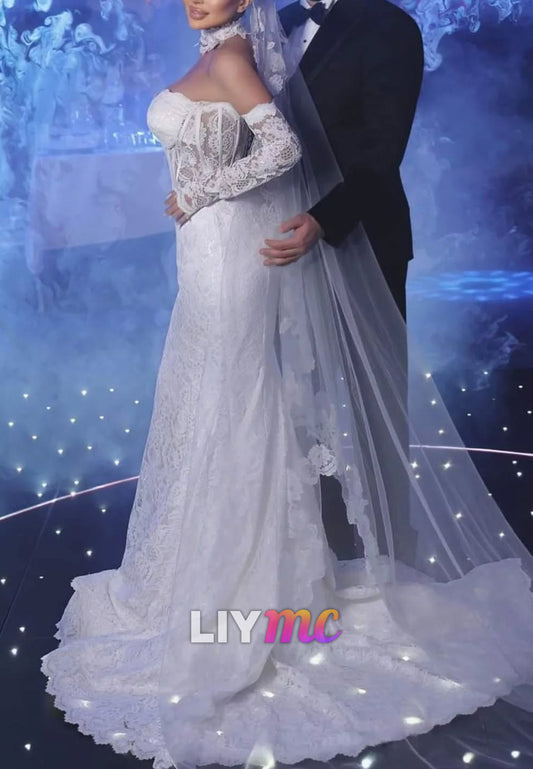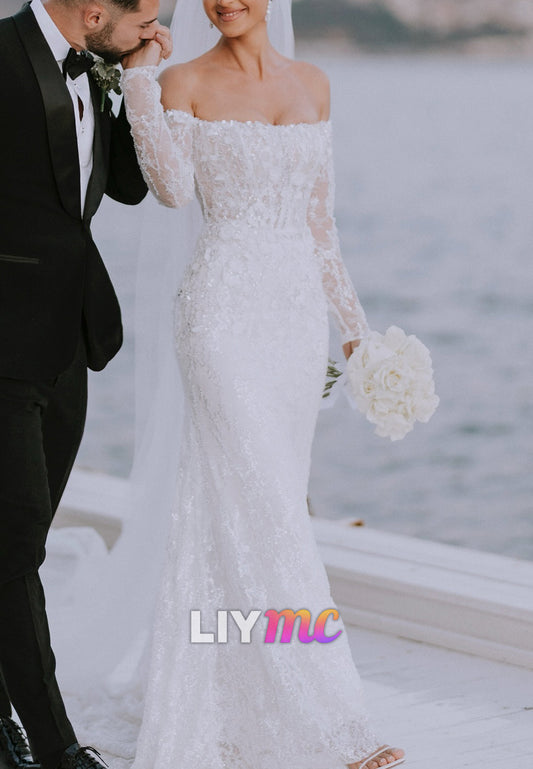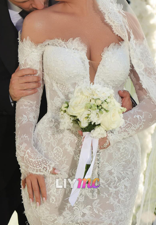 Off-Shoulder Long Sleeves Lace Appliques Mermaid Wedding Dress