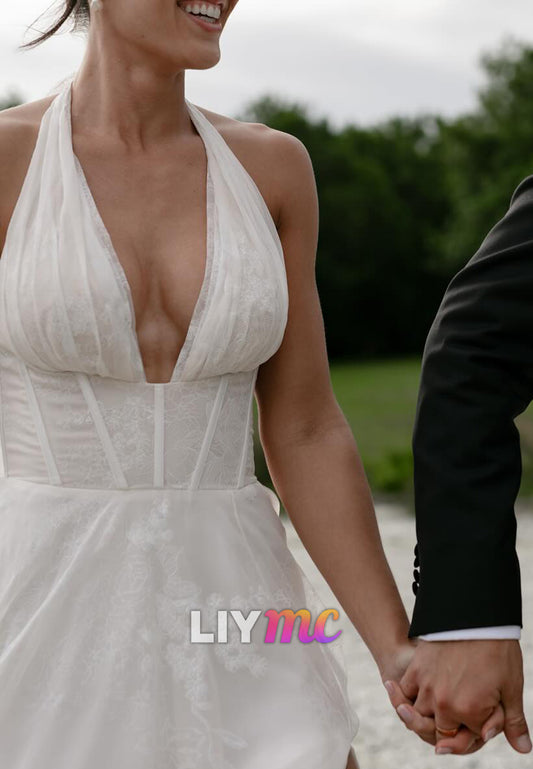 Halter V-Neck Appliques Sleeveless A-Line Wedding Dress