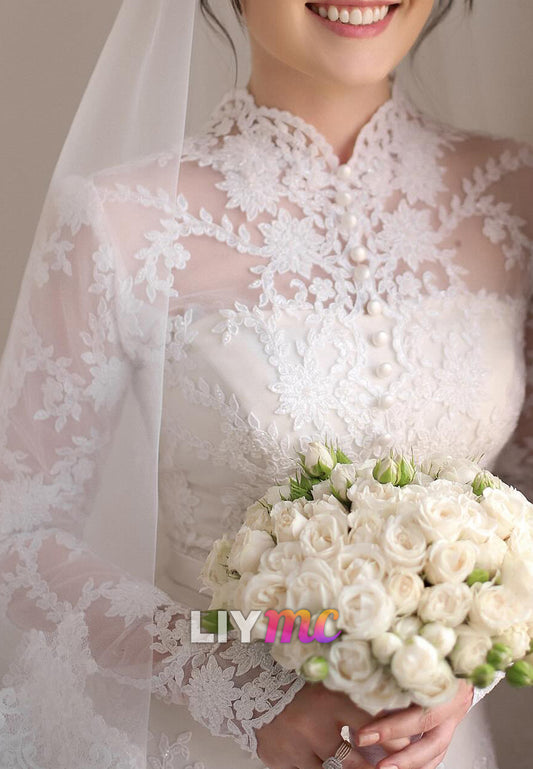 High Neck Long Sleeves Lace Appliques Button Sheath Wedding Dress
