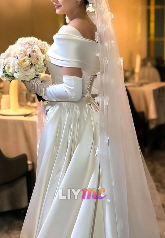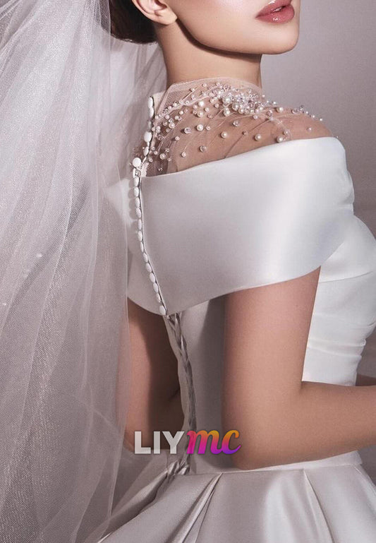 Off-Shoulder Sleek Satin Beading A-Line Wedding Dress