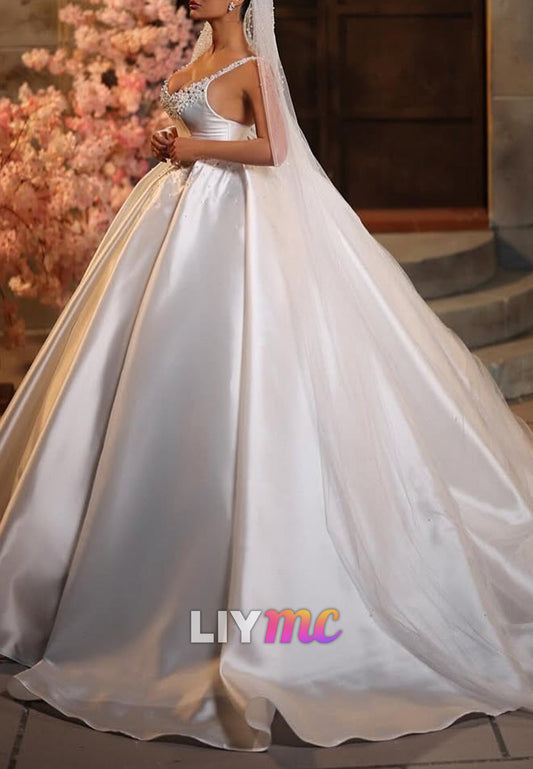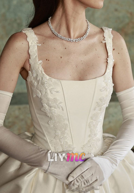 Scoop Straps Beaded A-Line Satin Wedding Dress