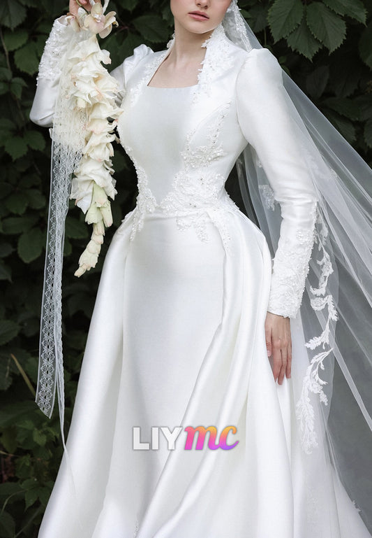Square Long Sleeves Satin Appliques Sheath Wedding Dress