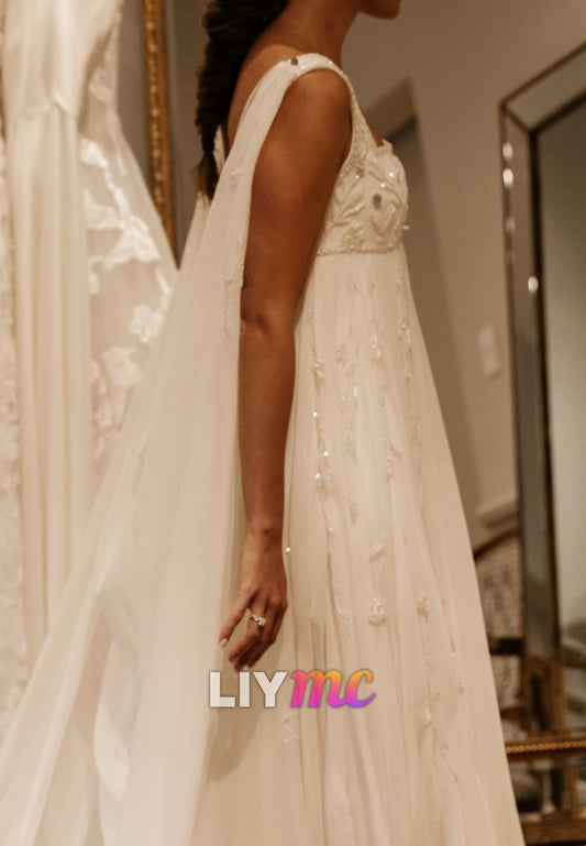 Square Straps Beaded Empire Waist A-Line Boho Wedding Dress