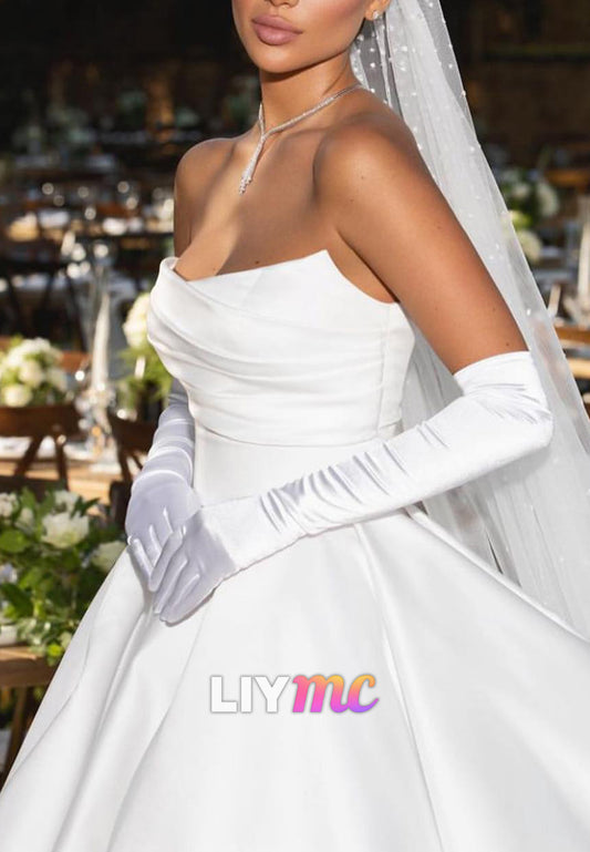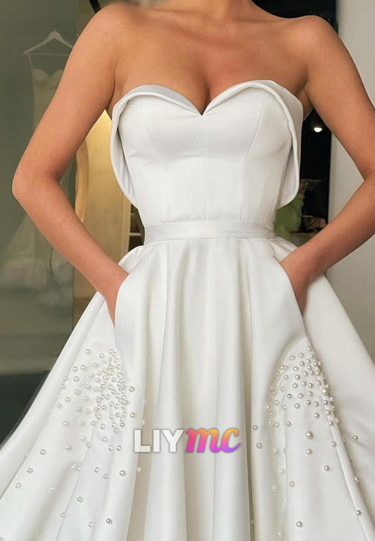Sweetheart Strapless Pearl A-Line Satin Wedding Dress