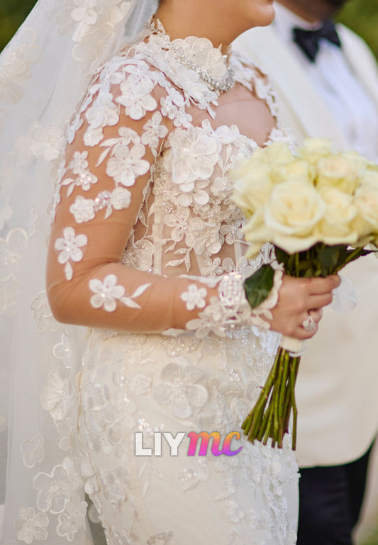 Sweetheart Long Sleeves Lace Appliques Beaded Mermaid Wedding Dress