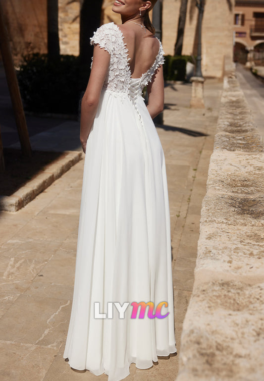 V-Neck Cap Sleeves Empire Waist Appliques A-Line Wedding Dress