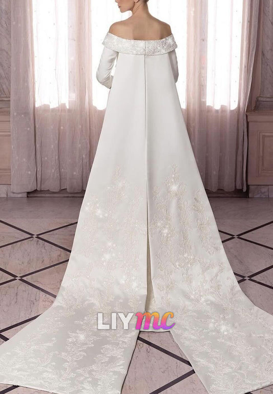 Off-Shoulder Long Sleeves Sequins Appliques Mermaid Wedding Dress