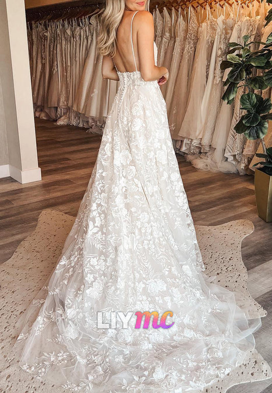 V-Neck Spaghetti Straps Empire Waist Appliques A-Line Wedding Dress