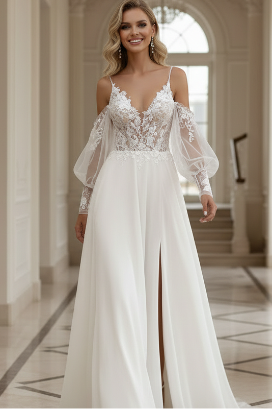 Embrace effortless elegance with this bohemian-inspired wedding dress, featuring delicate lace detailing throughout. The graceful A-line silhouette flatters every figure, while the romantic side slit adds movement and modern flair. Long sheer sleeves provide understated sophistication and gentle coverage, creating a dreamy, ethereal aesthetic. Perfect for the bride seeking a balance between bohemian charm and refined style, this gown captures timeless beauty with contemporary appeal.