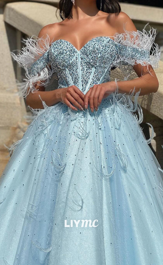 LP2010 - Sweetheart Puff Sleeves Beaded Feathered Ball Gown Prom Dress