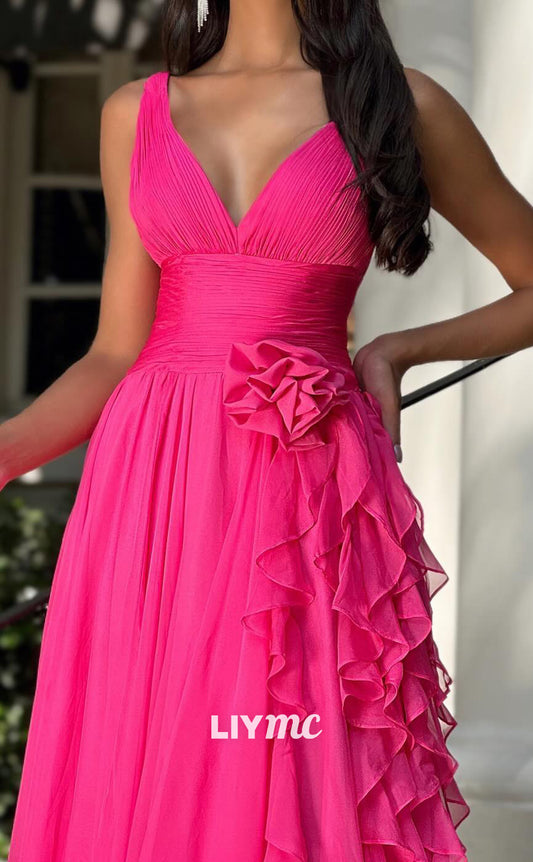 LP2020 - V-Neck Sleeveless Floral Sleek Satin A-Line Prom Dress