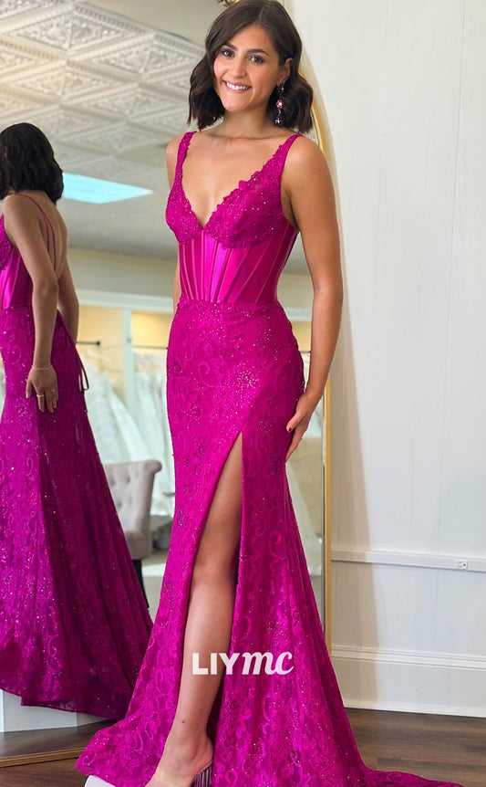 LP2089 - V-Neck Sleeveless Lace-Up High Slit Sparkly Sexy Mermaid Prom Dress