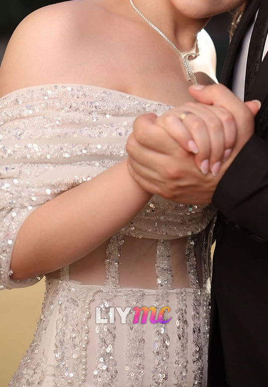 Off-Shoulder Beaded Embroidery Sparkly Mermaid Wedding Dress