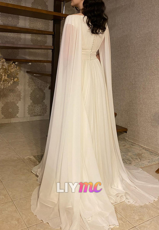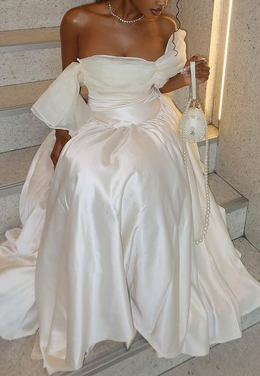 Off-Shoulder Chiffon Pleated Long Sleeves A-Line Wedding Dress