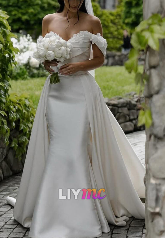 Off-Shoulder Detachable Train Pleated Mermaid Wedding Dress