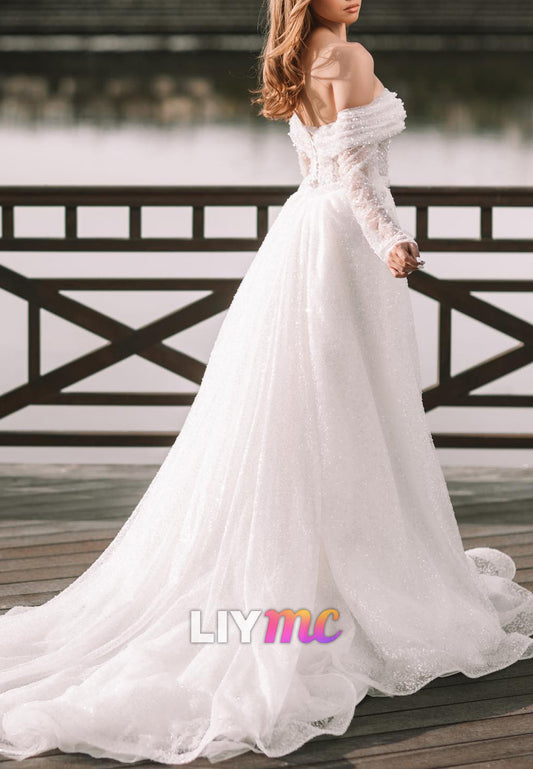Off-Shoulder Long Sleeves Beaded Pleated A-Line Wedding Dress