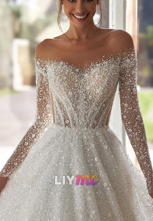 Off-Shoulder Long Sleeves Beaded Embroidery Sparkly Bridal Gown