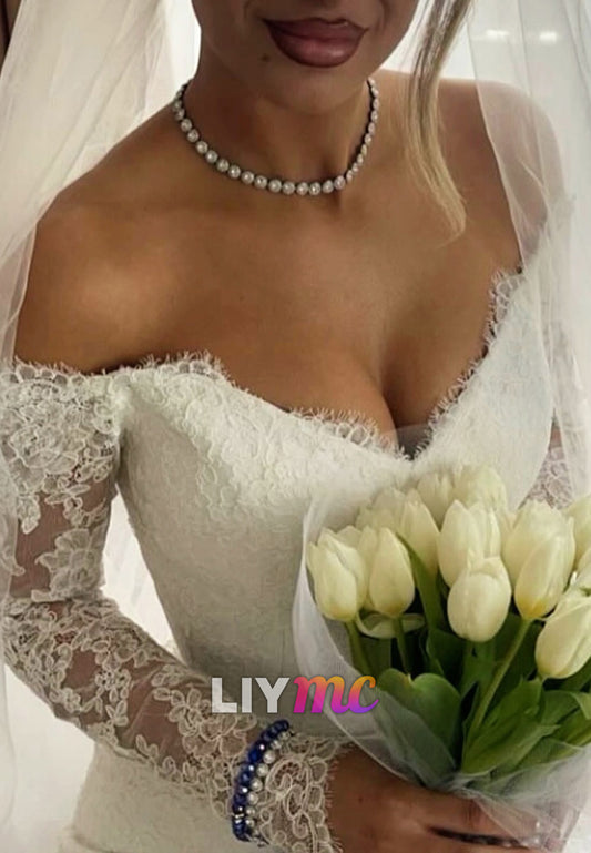 Off-Shoulder Long Sleeves Lace Appliques Mermaid Wedding Dress