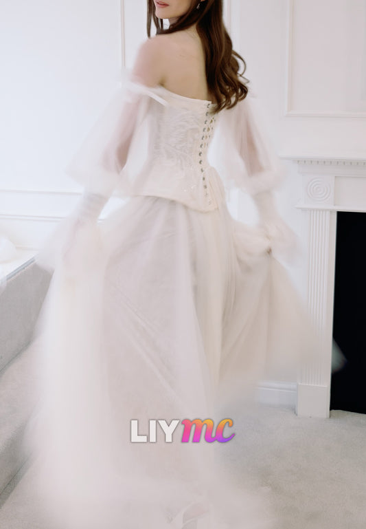 Sweetheart Long Sleeves Appliques Tulle A-Line Wedding Dress