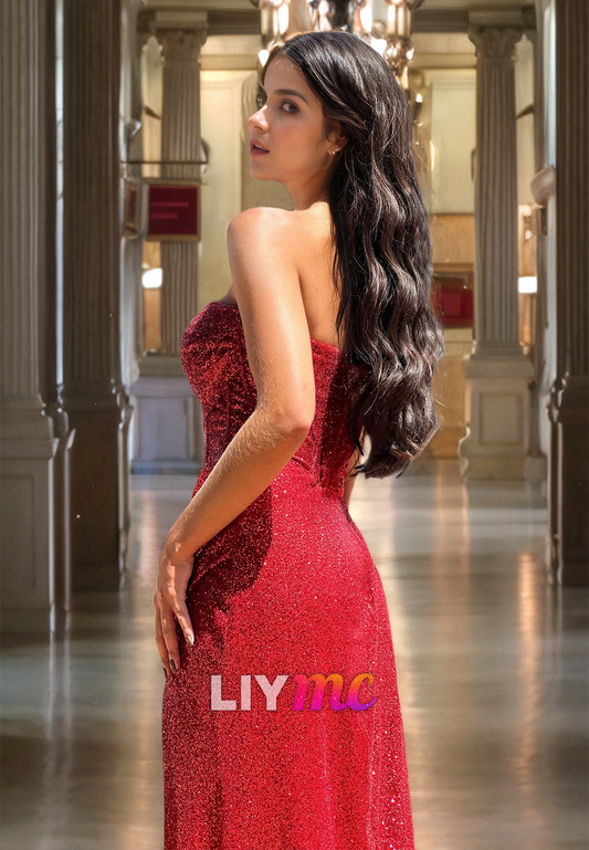 Sweetheart Strapless Pleated Ruched High Slit Sheath Prom Dress