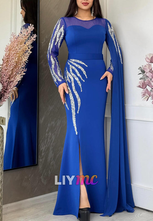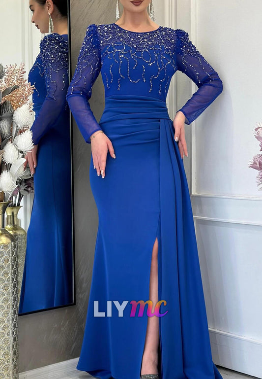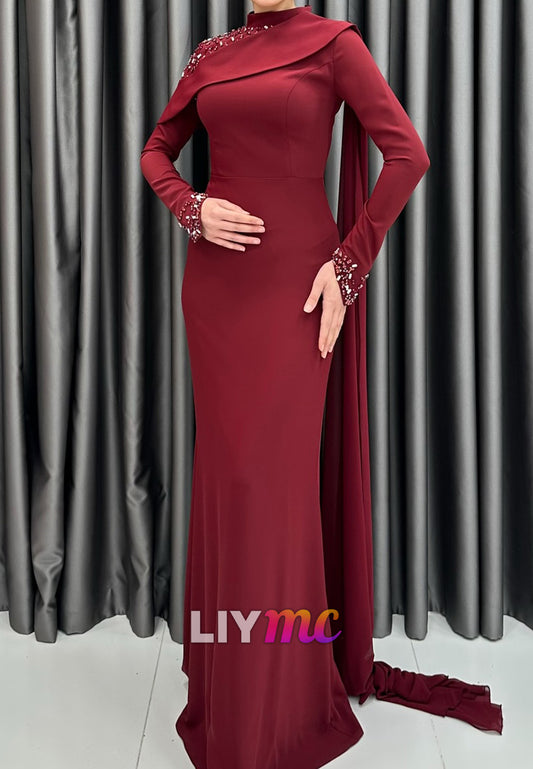 High Neck Long Sleeves Beaded Mermaid Evening Dress