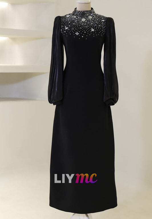 High Neck Long Sleeves Beaded Sheath Evening Dress