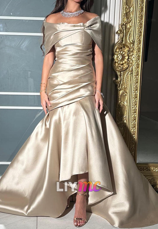 Off-Shoulder Short Sleeves Pleated Satin Mermaid Mother of Bride Dress