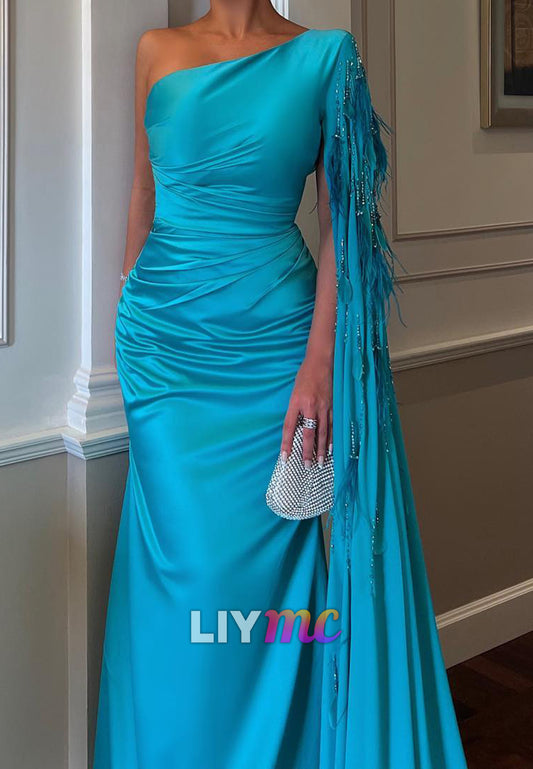 One Shoulder Long Sleeves Feathered Sheath Formal Dress