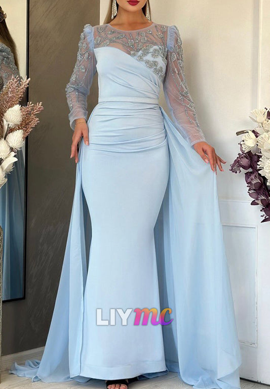 Scoop Long Sleeves Ruched Beaded Sheath Evening Dress