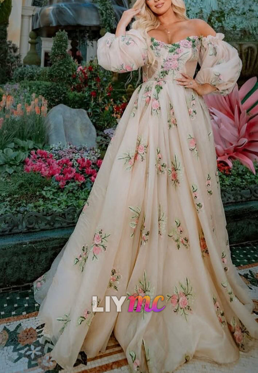 Sweetheart Long Sleeves Floral Printed A-Line Evening Dress