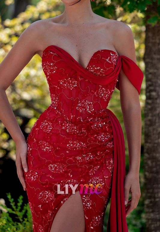Off-Shoulder Sequins Sparkly Slit Sheath Prom Dress