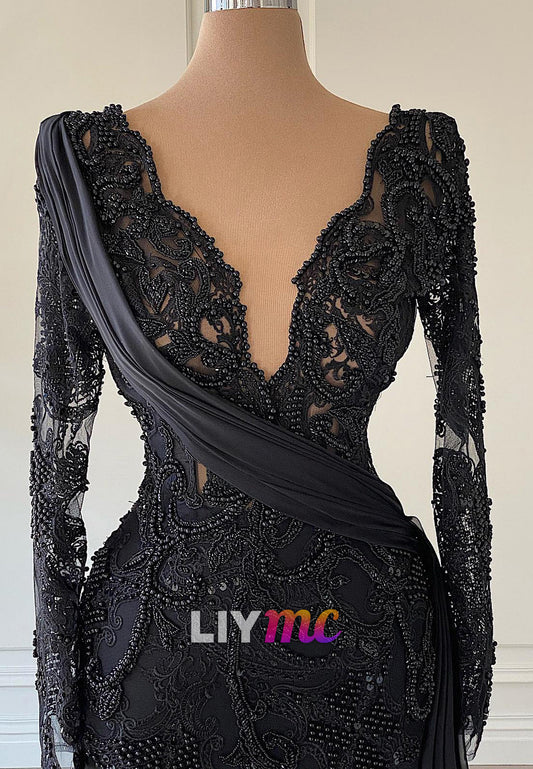 V-Neck Long Sleeves Appliques Fitted Mermaid Evening Dress
