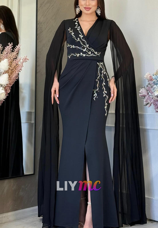 V-Neck Long Sleeves Beaded Sheath Evening Mother of Bride Dress