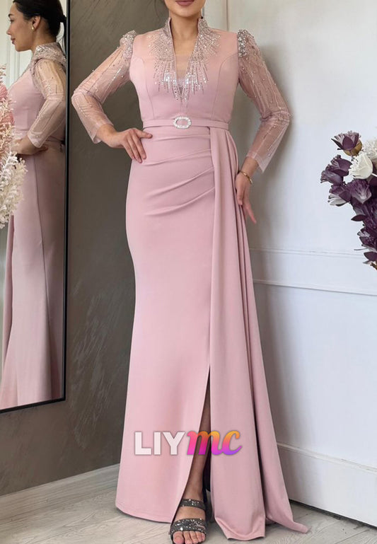 V-Neck Sparkly Long Sleeves Side Slit Sheath Mother of Bride Dress