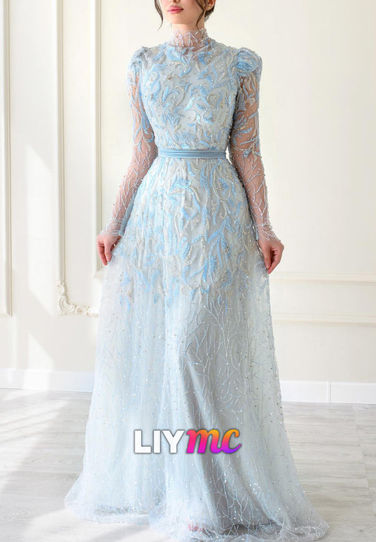 High Neck Long Sleeves Beaded Appliques A-Line Evening Dress