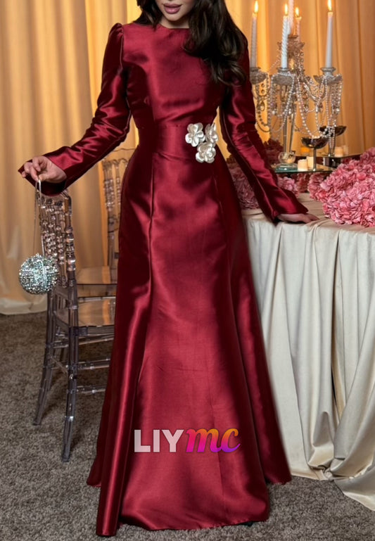 Scoop Long Sleeves 3D Floral Mikado Satin Evening Dress