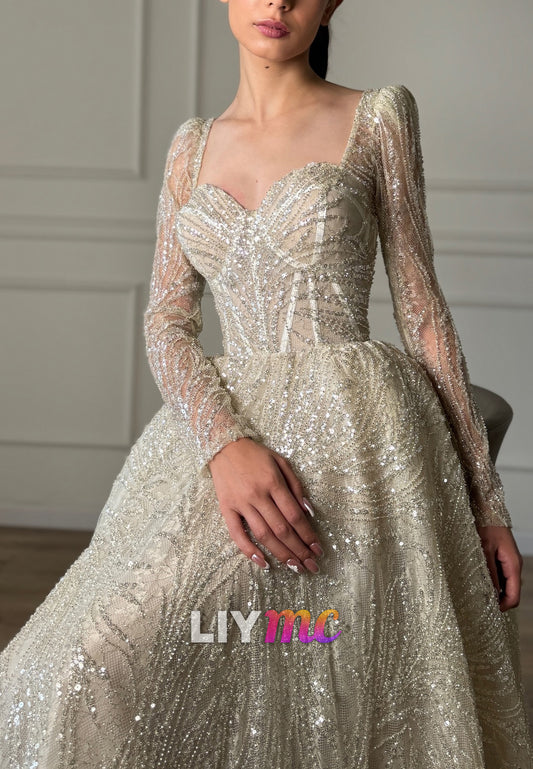 Sweetheart Long Sleeves Beaded Embroidery Sparkly A-Line Wedding Dress