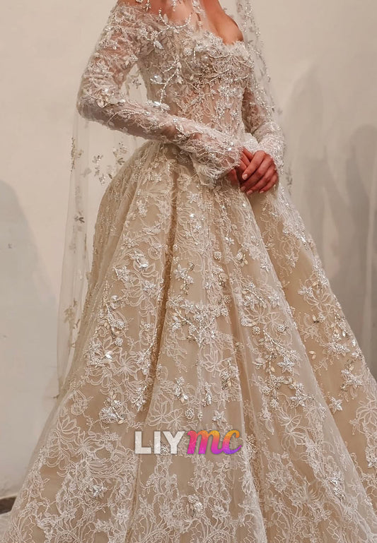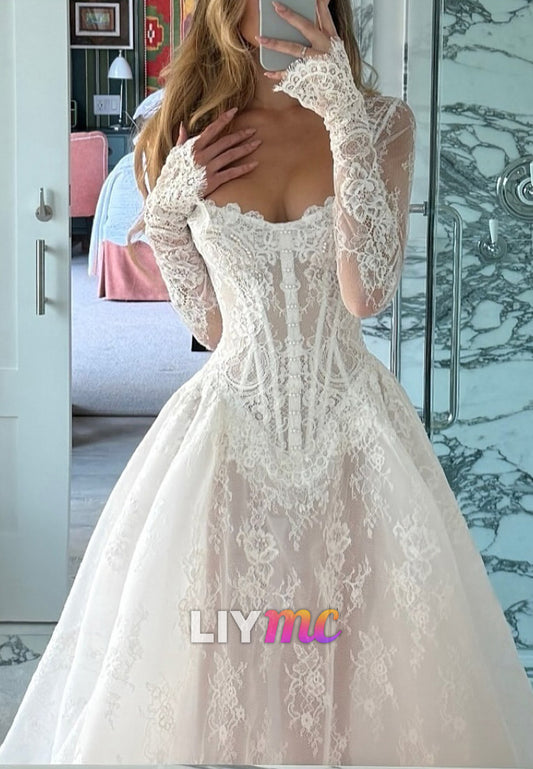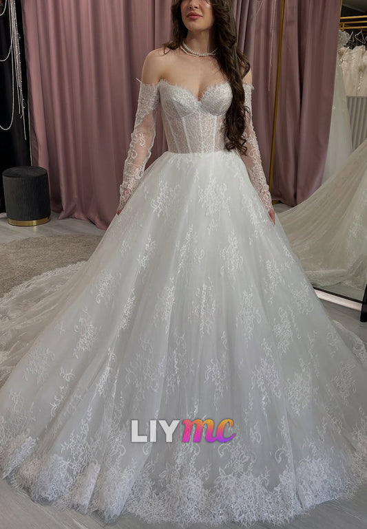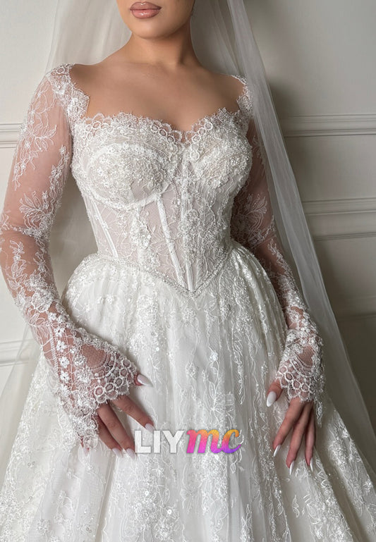 Sweetheart Long Sleeves Lace Appliques Beaded A-Line Wedding Dress