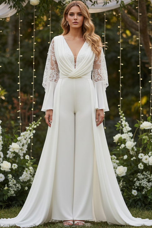V-Neck Long Sleeves Bridal Jumpsuits