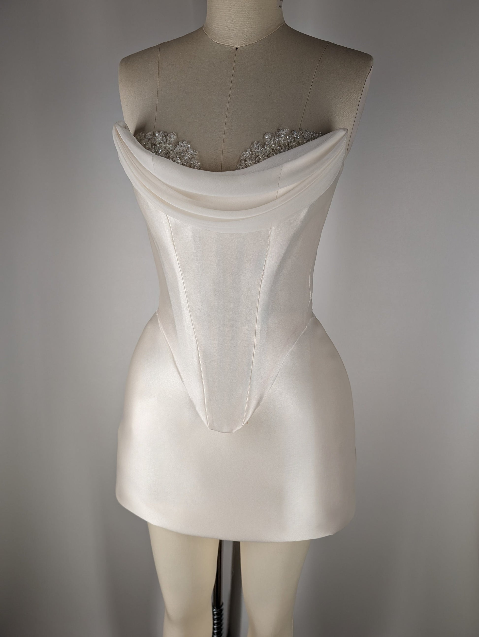 Cream Pearl White Duchess Satin Corset Draped Neckline Beaded Lace Crystal Embroidered Cups Mini Skirt Dress