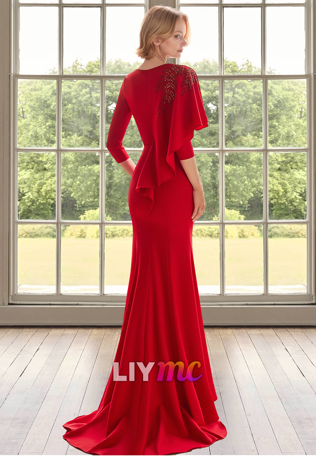 V-Neck Half Sleeves Appliques Mermaid Mother of Bride Dress