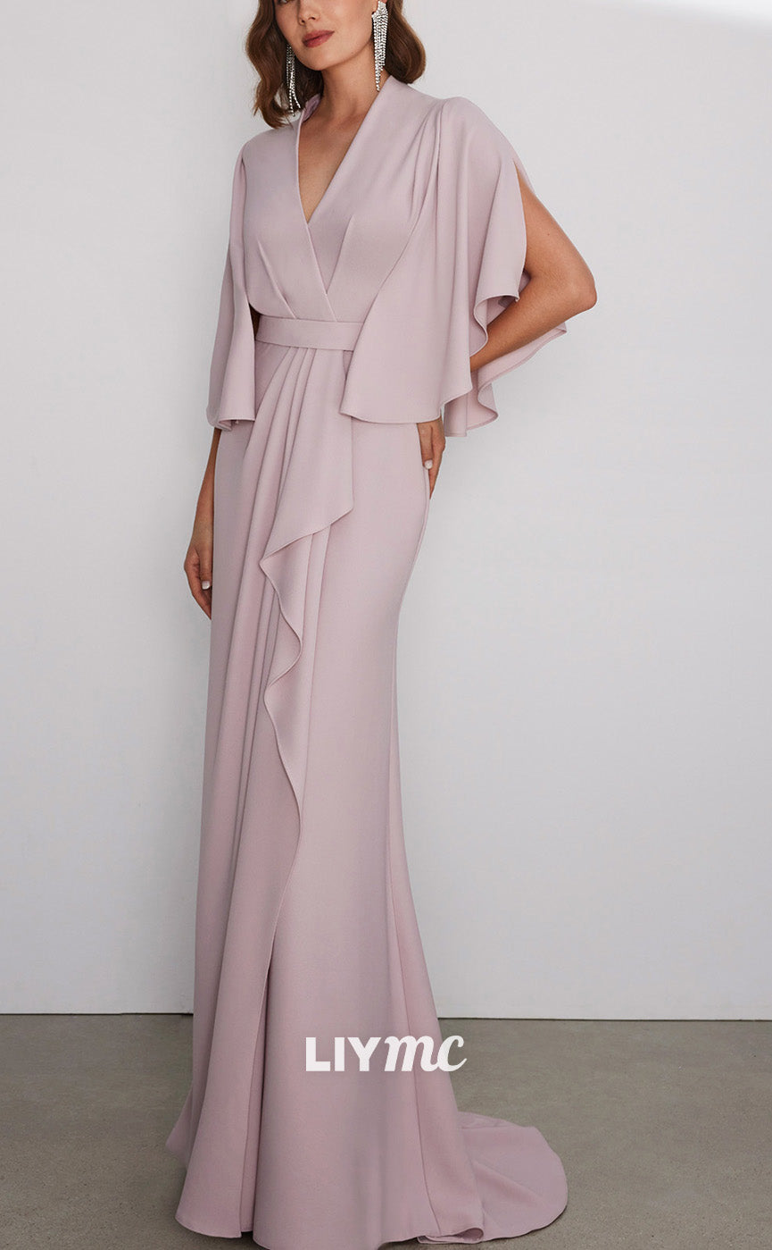 V-Neck Half Sleeves Ruffled Sleek Chiffon Long Mother of Bride Dress Cocktail Dress