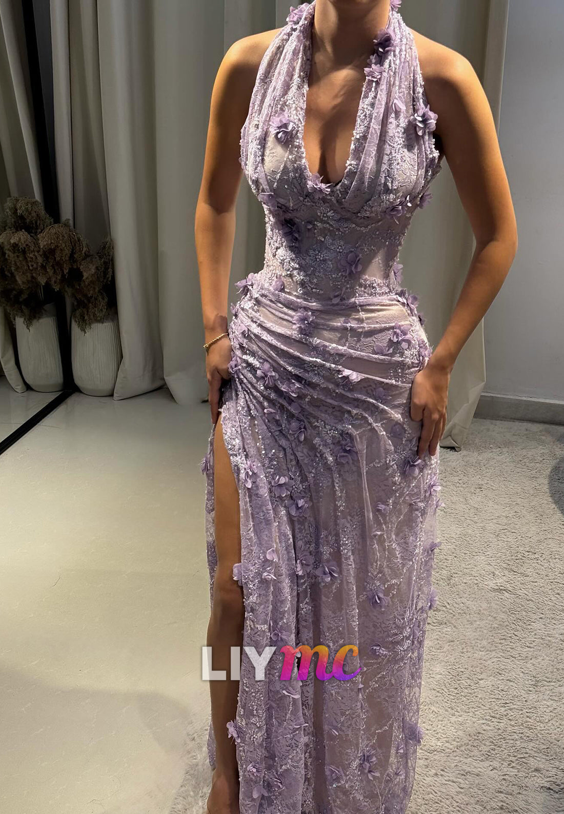 Halter V-Neck Sleeveless Floral Appliques Sheath Prom Dress