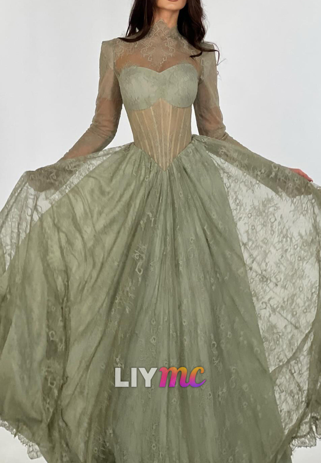 Embrace refined elegance with this sophisticated high-neck prom dress. The modest neckline exudes grace while ornate lace appliqués adorning the bodice showcase intricate craftsmanship and timeless beauty. The flowing A-line silhouette flatters your figure and allows for effortless movement throughout the evening. This dress perfectly balances classic restraint with luxurious detail, making it an ideal selection for prom, formal galas, and special occasions where understated sophistication is paramount.