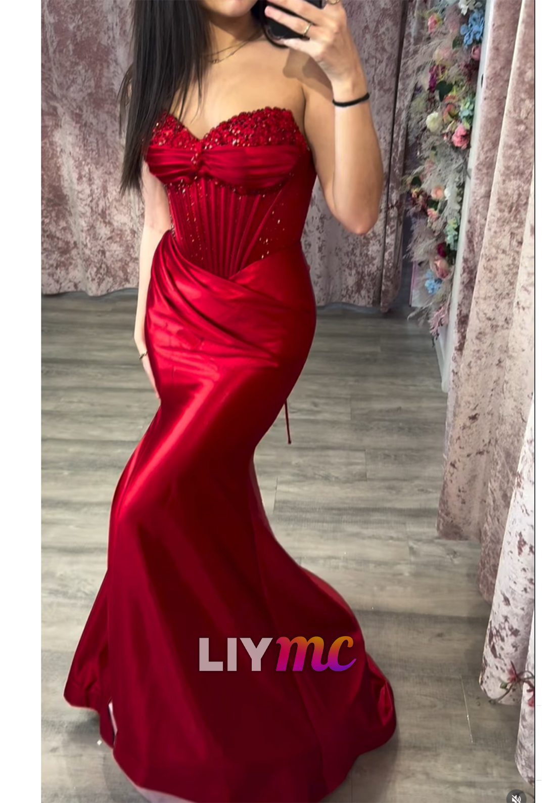 Sweetheart Beaded Satin Mermaid Red Prom Dress