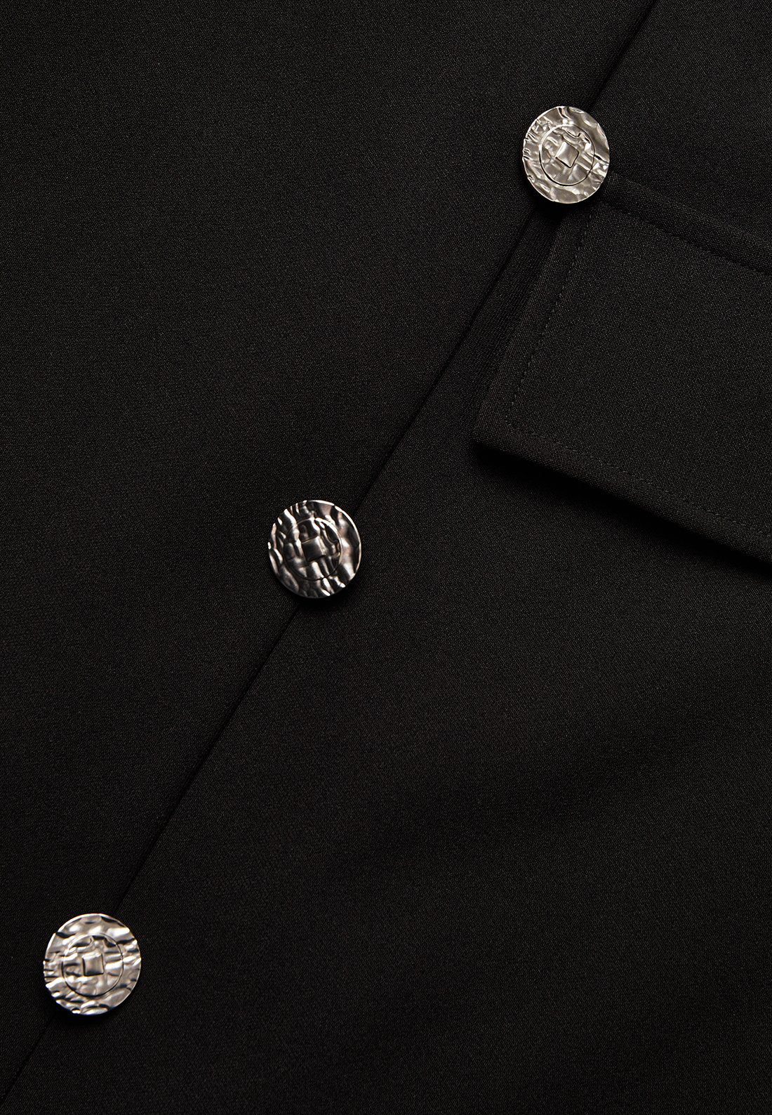 This Black Sleeveless Sheath Midi Dress features a classic V-neckline with a striking buckle detail and a subtle slit for added elegance. Its sleek silhouette offers a refined and sophisticated look, perfect for formal events or stylish evenings.