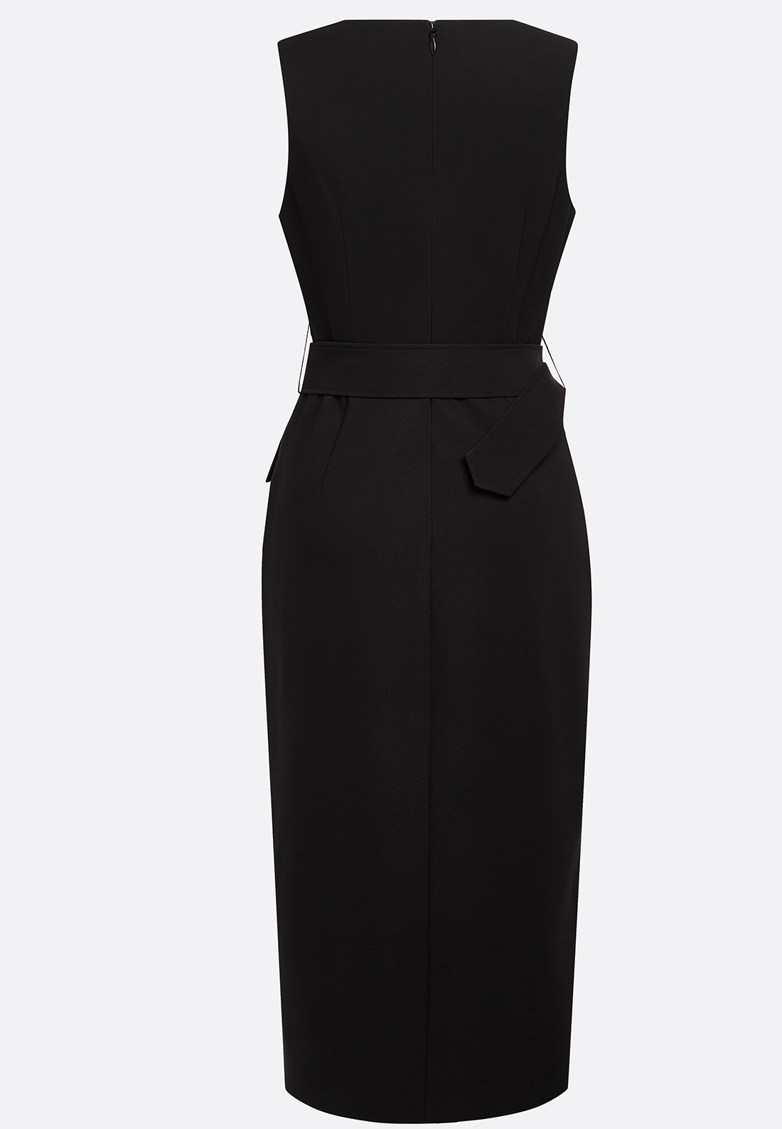 Black Buckle Slit Classic V Neck Sleeveless Sheath Midi Dress x 1;