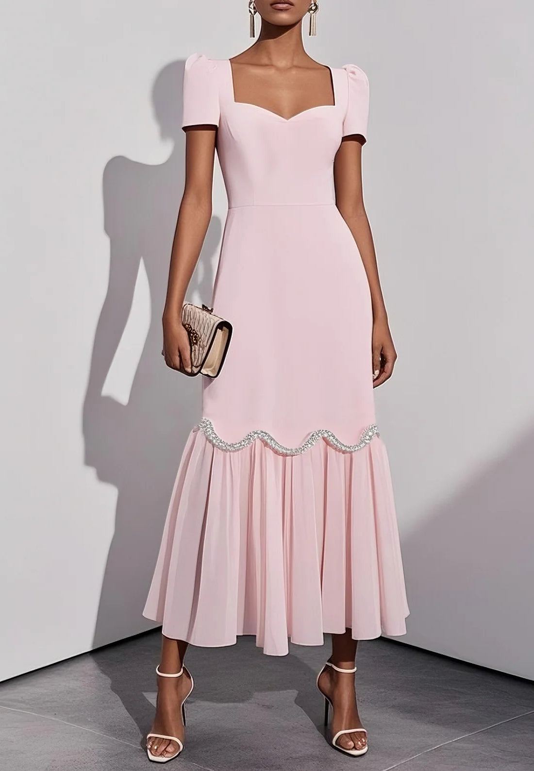 This pink A-line maxi dress features a classic sweetheart neckline and sleeveless design, adorned with subtle rhinestone embellishments for refined sparkle. Its elegant silhouette combines timeless charm with sophisticated detail, making it an ideal choice for formal occasions.